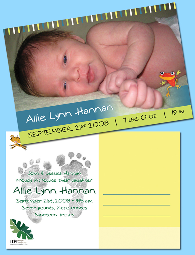 Here are some baby announcements that we put together for little miss Allie. These are on a 4×6 postcard to make them fun and exciting to mail and hang on refrigerators. Also, it allows the use of less expensive postage when large quantities are going to be shared with friends and family.