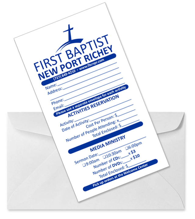 We finished up these Activities and Media Envelopes for First Baptist New Port Richey. They are 3 5/8″ x 6 1/2″. They are a one color print that will be Pantone 280.