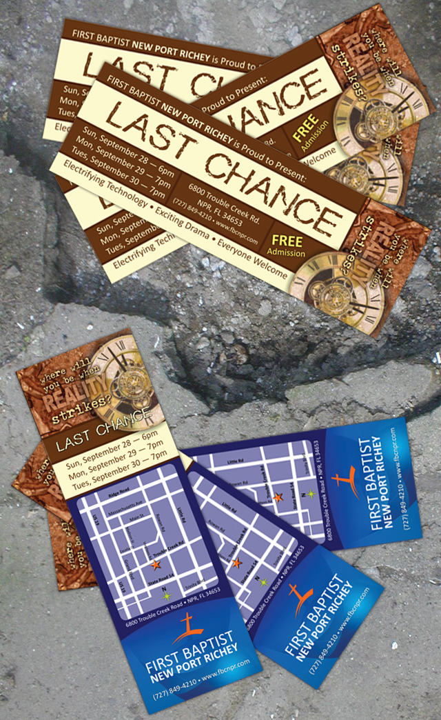 Where will you be when reality strikes? First Baptist NPR is doing another performance of Last Chance this year. They ordered 10k 2×6 tickets to pass out to help invite people to the Church.