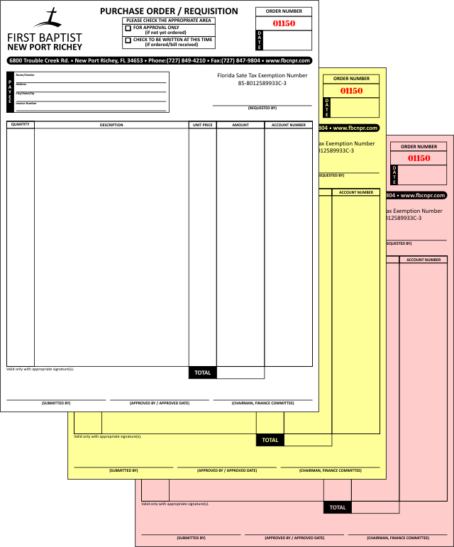 We finalized these Purchase Orders for First Baptist NPR today. The are NCR forms for in-house use. The original size was 8.5×7 but increased them to full page (8.5×11). We also put together a new layout to help make the POs more user friendly.