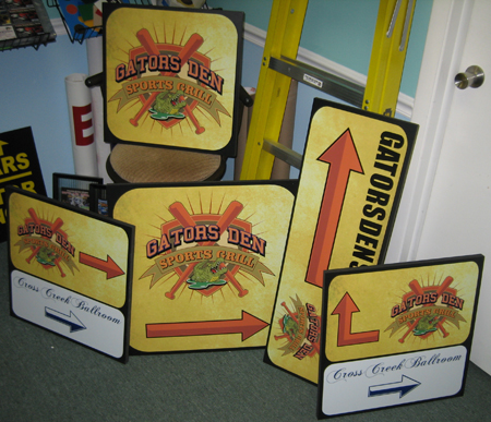 Today we finished production on some really awesome signs. These are some directional signs for the Gators Den. They will be placed outside all around the Best Western Gateway Grand in Gaineville, FL to help guide their guest to the restaurant. We knew that these signs were going to look good but they turned out great! They are digital printed vinyl on some 3/4″ black PVC board.