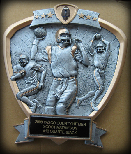 The Pasco County Hitmen, a local football team, ordered a nice plaque for their quarterback to show their appreciation for all of his hard work and dedication to the team.