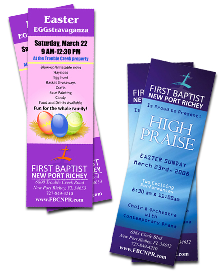 First Baptist NPR ordered some tickets for their annual Easter Eggstravaganza, a large egg hunt and fun for children. On the reverse side is a ticket to HIGH PRAISE the church’s Easter morning drama.